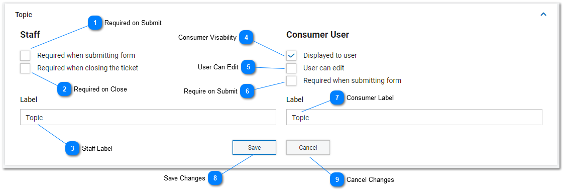 Define the field caption associated with the "Topic" field that displays for Agents and Staff and Consumer Users. Set the field visibility and requirements for Agents and Staff and Consumer Users when submitting a new task or issue or editing and existing task or issue.